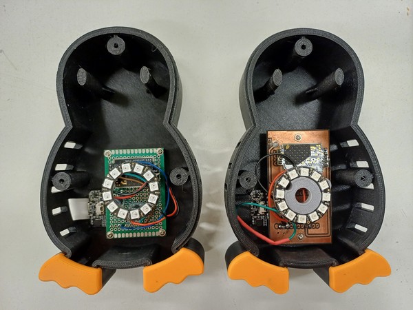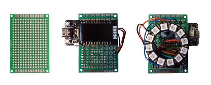 The electronic part of JaspAir can be done in 2 ways: with a "protoboard 40x60mm" (left) or with a printed circuit board (right). In the case of the protoboard, the LED ring is mounted using spacers that are glued in place. The PCB is still under development.